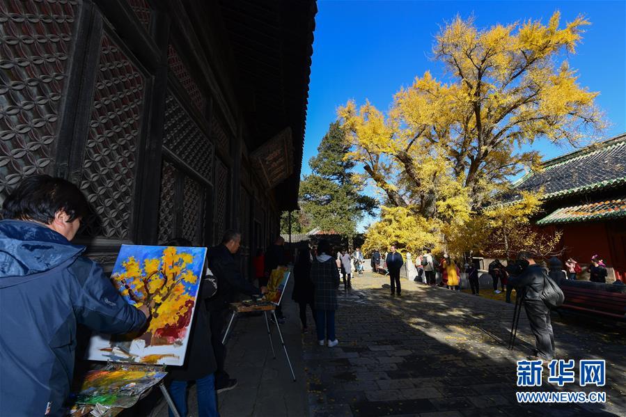 11月11日,繪畫愛好者在大覺寺內的古銀杏樹旁寫生。新華社記者尹棟遜攝