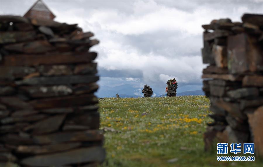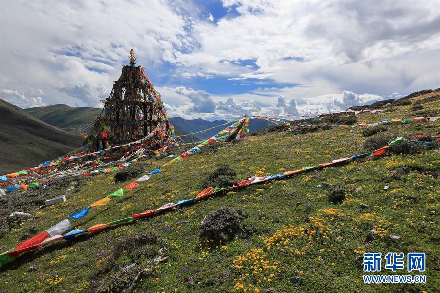 在川藏公路四川折多山埡口,藍(lán)天白云與經(jīng)幡、草地、鮮花構(gòu)成一幅美麗畫卷(6月28日攝)。新華社記者江宏景攝
