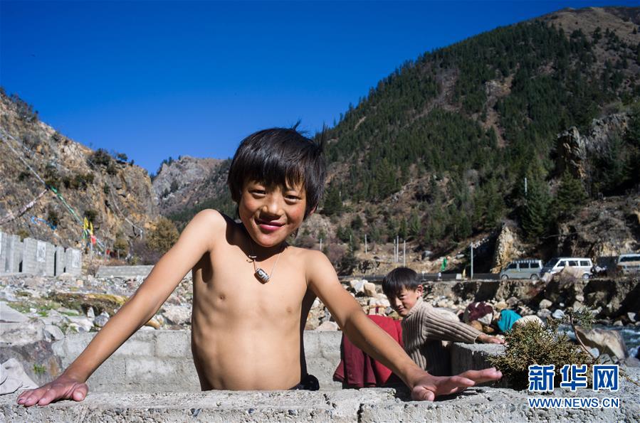 在318國道邊的四川巴塘縣德達溫泉,小朋友在沐?。?0月18日攝)。新華社記者江宏景攝