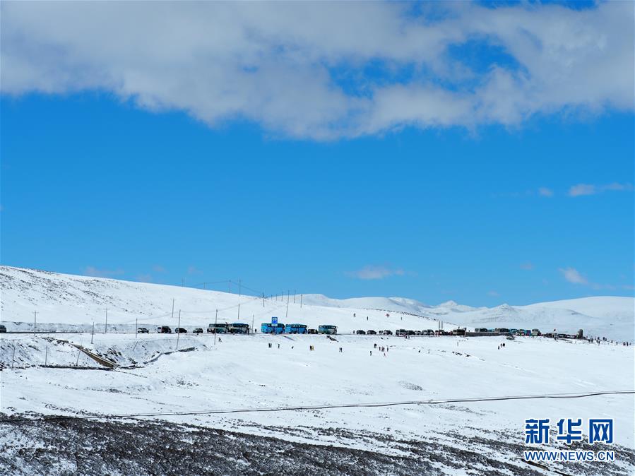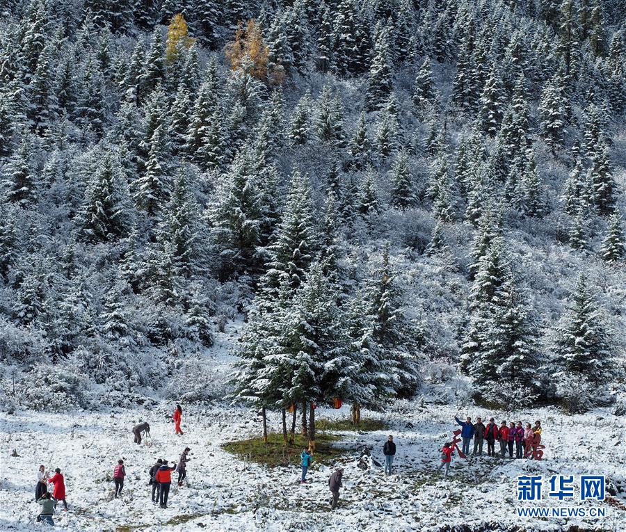 在318國道四川卡子拉山埡口,游人在雪地里留影、嬉戲(10月17日攝)。新華社記者江宏景攝