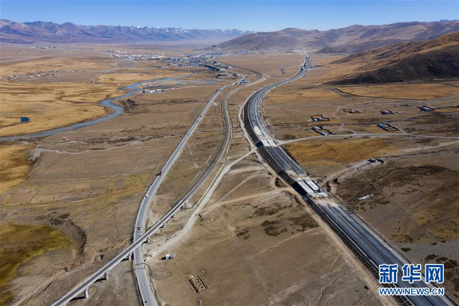 西藏當(dāng)雄縣城附近,青藏鐵路、國道和即將完工的公路并行(10月28日攝)。新華社記者江宏景攝