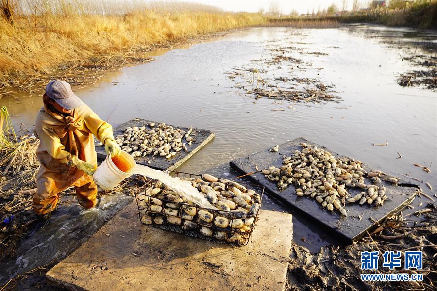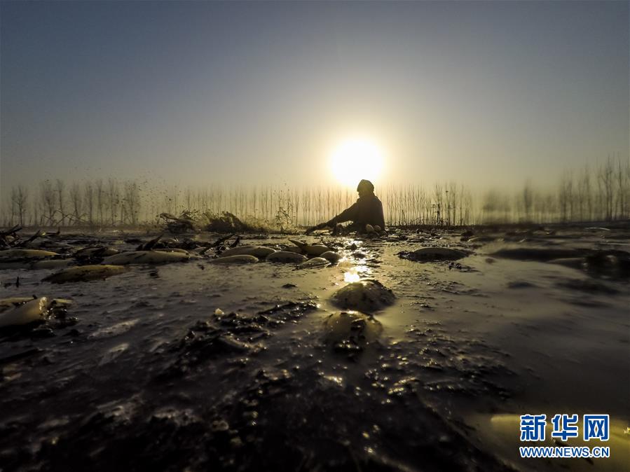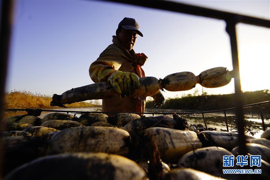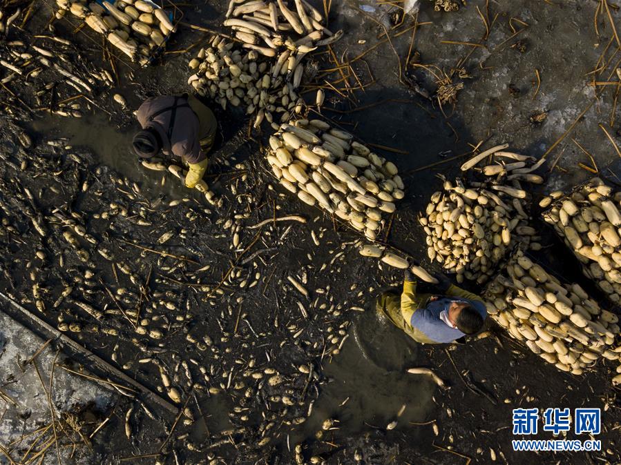 11月18日,工人在采收蓮藕。初冬時節(jié),河北省唐山市曹妃甸蓮藕豐收,工人們在結(jié)冰之前忙著采收蓮藕。新華社記者楊世堯攝