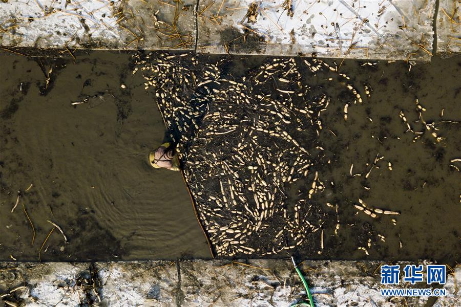 1月31日,在雄安新區(qū)安新縣東向陽村的一處藕塘,挖藕工清洗挖出來的藕(無人機航拍)。新華社記者沈伯韓攝