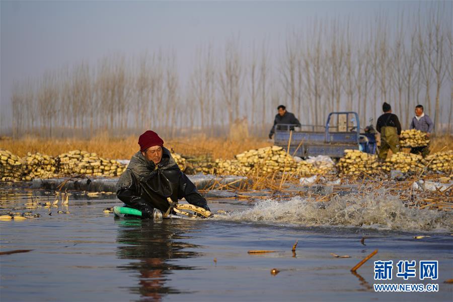 11月18日,工人在采收蓮藕。初冬時節(jié),河北省唐山市曹妃甸蓮藕豐收,工人們在結(jié)冰之前忙著采收蓮藕。新華社記者邢廣利攝