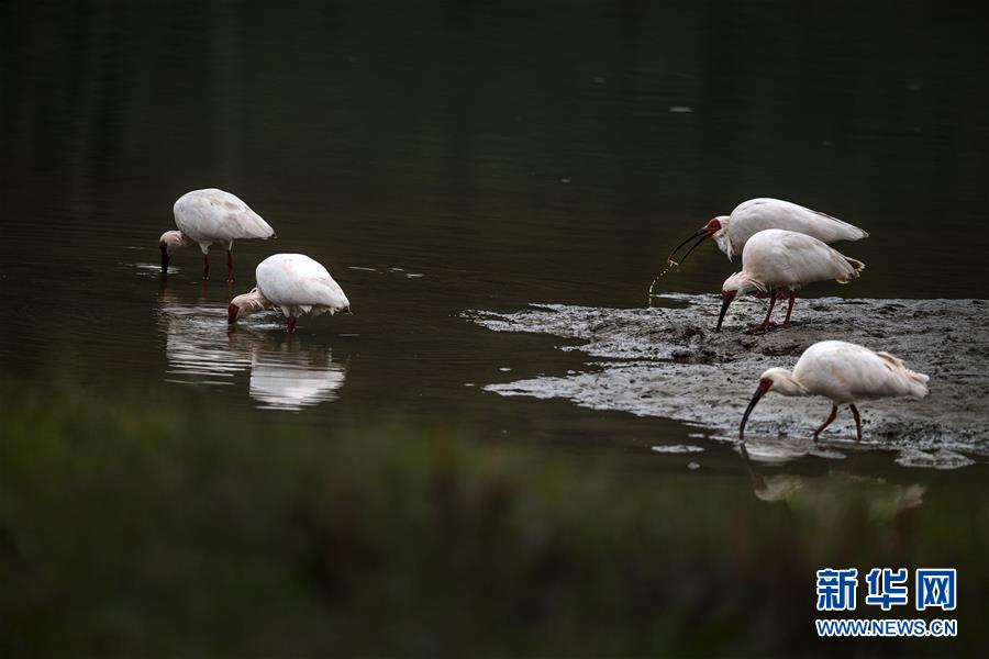 11月19日,朱鹮在陜西省漢中市西鄉(xiāng)縣峽口鎮(zhèn)井壩村牧馬河里覓食。 新華社記者陶明攝