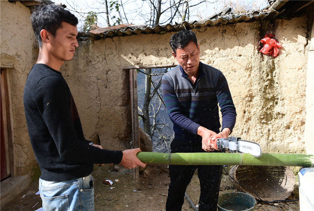 2019年11月16日,四川涼山,裝好電鋸后,楊陽(yáng)的父親某色蘇拉澤開(kāi)始試用起來(lái)。