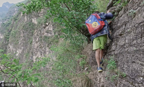 爬山開始前,陳木黑被陳古吉系上背包繩。前面由一個(gè)家長引路,中間一個(gè)家長,陳古吉帶著陳木黑走最后,6歲的陳木黑已經(jīng)在這條路上,上上下下幾十次了。圖片來源:視覺中國