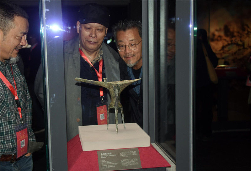 圖為參加開(kāi)館儀式的專(zhuān)家學(xué)者參觀(guān)“鎮(zhèn)館之寶”之一的乳釘紋銅爵酒禮器(夏,二里頭文化四期)。