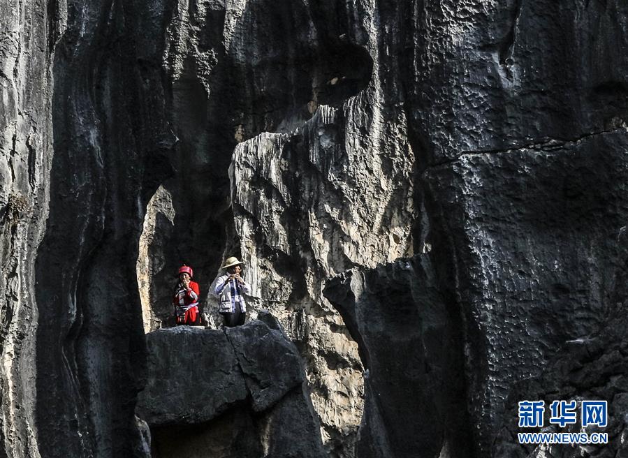 當(dāng)?shù)厣贁?shù)民族樂(lè)手在石林景區(qū)演奏民族音樂(lè)(11月27日攝)。新華社記者蘭紅光攝