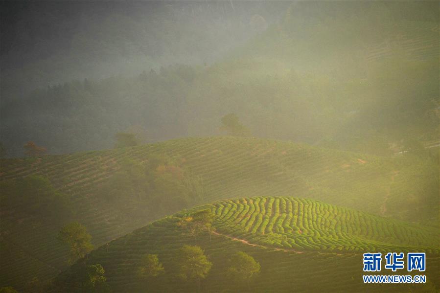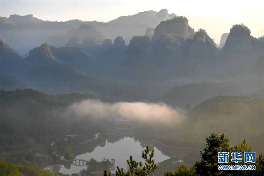 福建省武夷山的茶山云霧繚繞,在朝陽(yáng)照射下如夢(mèng)如幻(11月17日攝)。新華社記者宋為偉攝