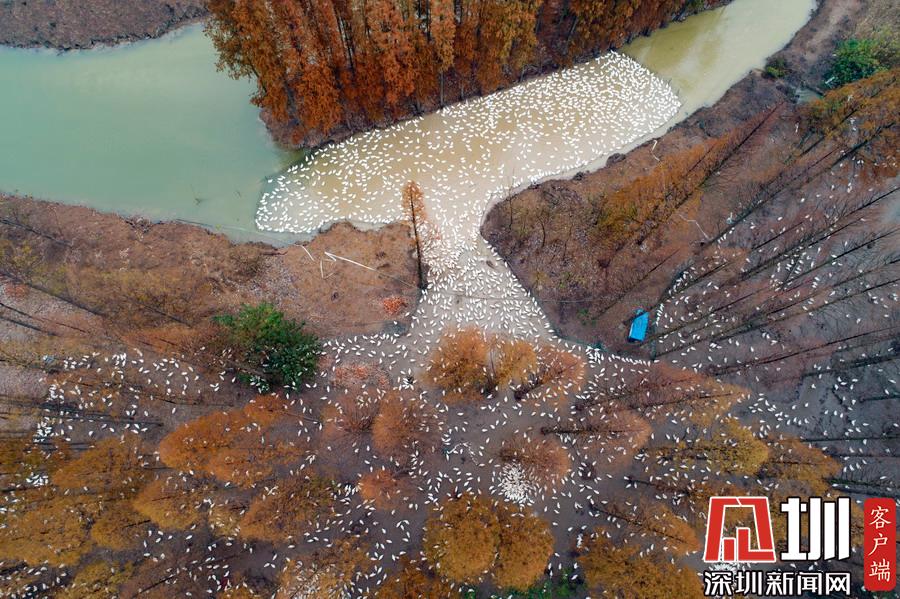 2019年12月1日,江蘇省宿遷市泗洪縣,航拍5000多只四季鵝在陳?ài)琢謭?chǎng)的樹(shù)林下吃食的壯觀場(chǎng)景。
