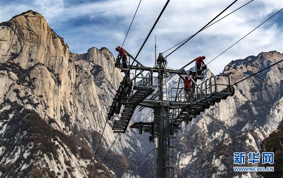 華山太華索道維修人員在進行索道支架橫擔檢測(12月5日攝)。