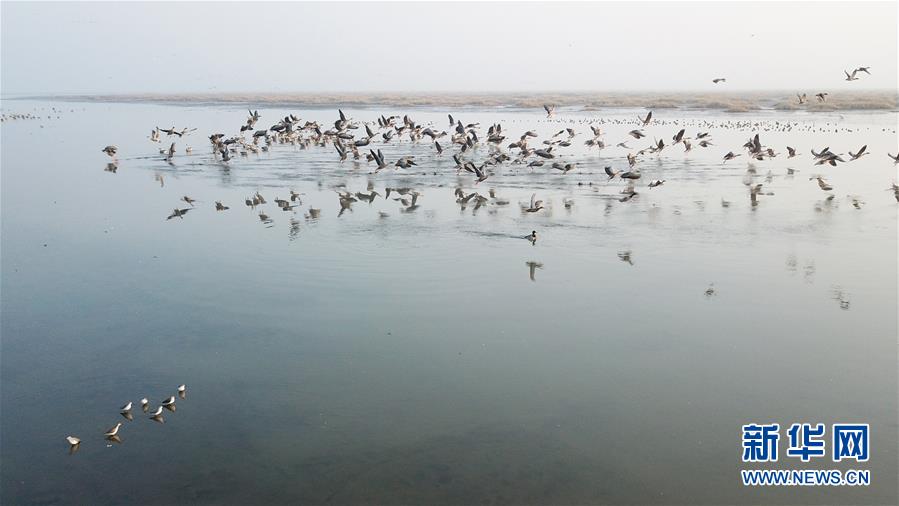 12月7日,候鳥在升金湖上空飛翔(無人機拍攝)。新華社記者張端攝