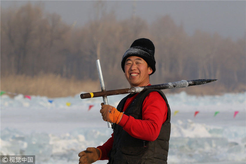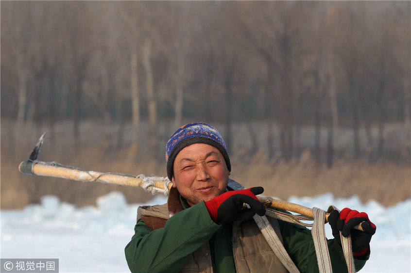 2018年12月11日,黑龍江省哈爾濱市,松花江上,采冰者們彎腰拉繩,宛如纖夫般拽重達(dá)半噸的冰塊出水。采冰者都是自哈市江北萬寶、東發(fā)、沙陀子等鄉(xiāng)鎮(zhèn)的農(nóng)民,他們每年冬閑時都會親屬、村鄰之間結(jié)伴到松花江畔采冰,有的采冰人,已經(jīng)連續(xù)干了二十多年。每個采冰季,他們每天要在冰面上工作10-12個小時,每個采冰組,一天要拽出冰塊2000-3000塊,一個近20天的采冰季,每人能收入近萬元。