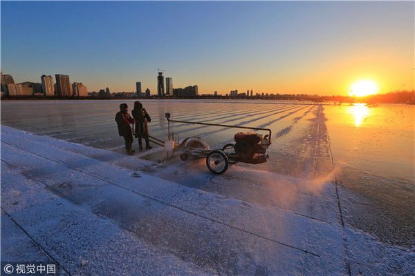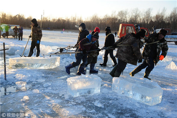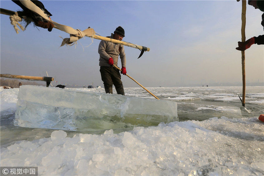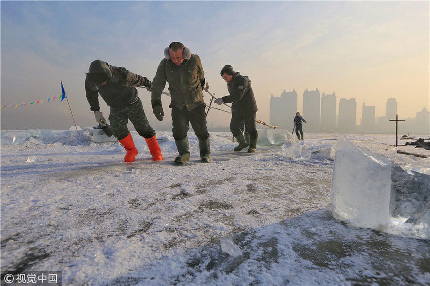 2018年12月11日,黑龍江省哈爾濱市,松花江上,采冰者們彎腰拉繩,宛如纖夫般拽重達(dá)半噸的冰塊出水。采冰者都是自哈市江北萬寶、東發(fā)、沙陀子等鄉(xiāng)鎮(zhèn)的農(nóng)民,他們每年冬閑時都會親屬、村鄰之間結(jié)伴到松花江畔采冰,有的采冰人,已經(jīng)連續(xù)干了二十多年。每個采冰季,他們每天要在冰面上工作10-12個小時,每個采冰組,一天要拽出冰塊2000-3000塊,一個近20天的采冰季,每人能收入近萬元。視覺中國