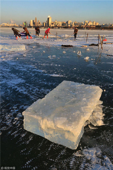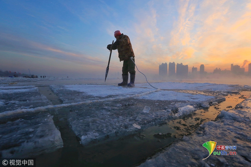 2018年12月8日,最低氣溫零下22度,哈爾濱市江北公路大橋東側(cè)的江面上,工人們正在從江中撈取冰塊,裝車運(yùn)往景區(qū)制作冰燈、冰雕。現(xiàn)場,工人先是用電鋸、鐵釬將冰分割成半米多寬,一米多長的冰塊,接著將其拉出水面。等候在旁的叉車上前,將冰裝上運(yùn)冰的卡車,之后裝滿冰塊的卡車駛往景區(qū)。