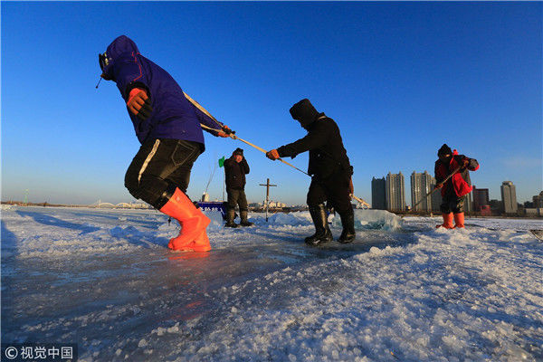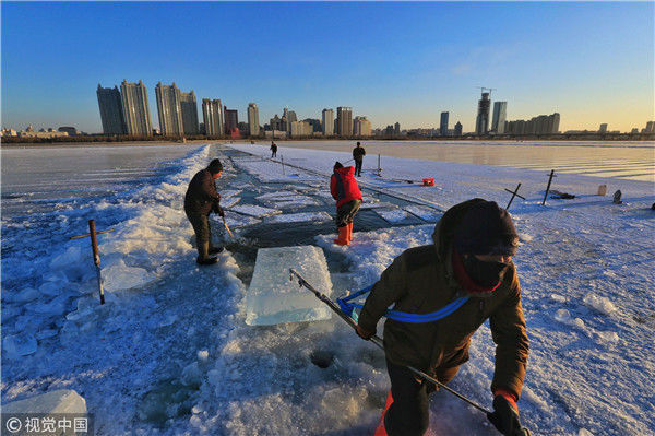 2018年12月08日,黑龍江省哈爾濱市,松花江采冰,今日正式出冰。本次采冰,是為第二十屆哈爾濱冰雪大世界的建造而進(jìn)行。視覺中國