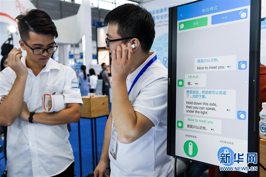 2018年11月16日,在深圳舉行的第20屆高交會上,來自深圳的年輕創(chuàng)客(右)向參觀者介紹團(tuán)隊研發(fā)的同聲傳譯耳機(jī)。 新華社記者 毛思倩 攝