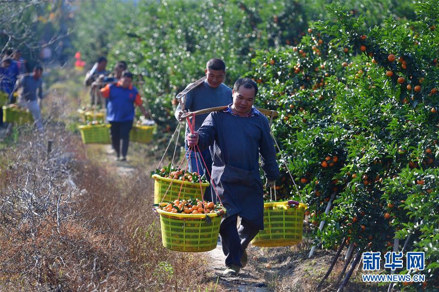 12月11日,廣西柳州市鹿寨縣四排鎮(zhèn)四排村村民在果園里挑運砂糖橘。新華社記者 黃孝邦 攝