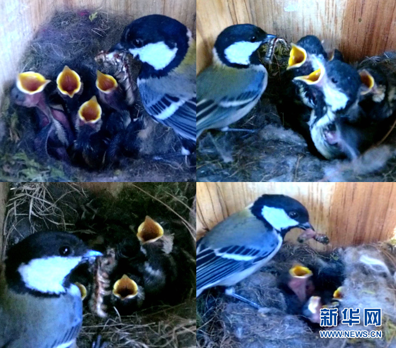 拼版照片:羅康在人工巢箱里安裝的錄像設(shè)備拍攝到鳥(niǎo)類(lèi)在以松毛蟲(chóng)喂食幼鳥(niǎo)(資料照片)。 新華社發(fā)
