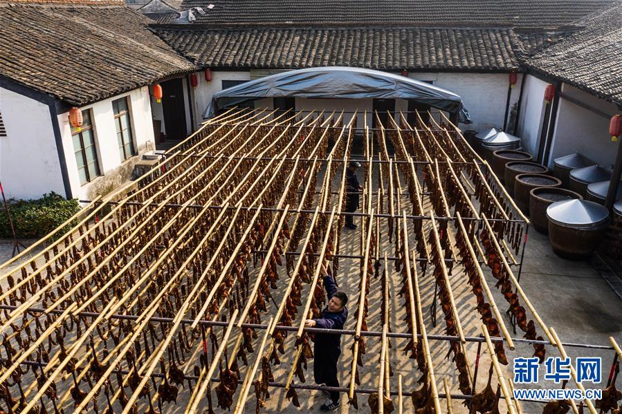 12月3日,安昌古鎮(zhèn)傳統(tǒng)臘味作坊里曬滿了各種手工制作的紹興臘味(無人機拍攝)。新華社記者徐昱攝