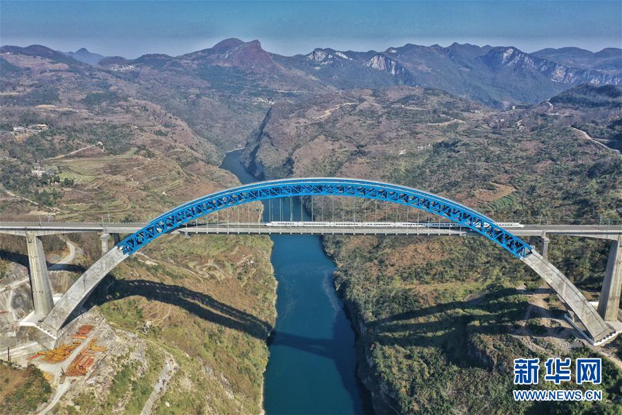 12月16日,一列動車組列車從成貴高鐵鴨池河特大橋上駛過(無人機拍攝)。新華社記者歐東衢攝