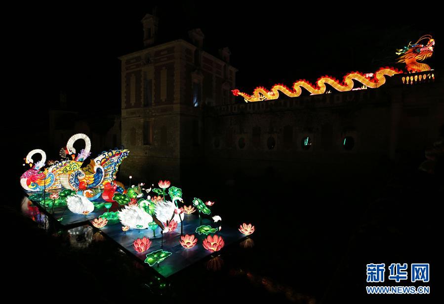 12月15日,在法國謝爾河畔塞勒市的塞納古堡,中國彩燈與城堡雕塑相得益彰。 新華社記者 高靜 攝