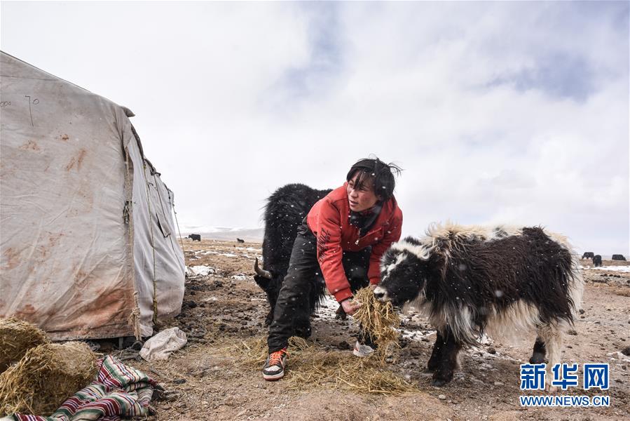 2月22日,才巴拉加在麥雄灘的帳篷前給牛犢喂飼料。今年年初,青海省玉樹藏族自治州遭遇重度雪災(zāi),部分地區(qū)積雪深度超過半米,牲畜覓食困難,餓死凍死超2萬頭只。麥雄灘位于巴顏喀拉山腳下的玉樹藏族自治州稱多縣清水河鎮(zhèn)文措村,是此次玉樹雪災(zāi)中化雪較快、接納受災(zāi)轉(zhuǎn)場外地牧民最多的地點之一。文措村黨支部書記白尕召集村民開會,大家一致同意拿出30萬畝草場,供受災(zāi)更嚴重的其他地區(qū)牧民使用。新華社記者吳剛攝