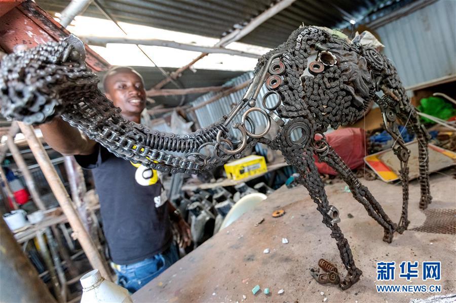 12月20日,在肯尼亞內(nèi)羅畢庫奧納藝術中心,一名藝術家展示裝置藝術作品。成立于1995年的庫奧納藝術中心位于肯尼亞首都內(nèi)羅畢市區(qū),目前有17間雕塑、繪畫等藝術工作室。中心不定期舉辦藝術展覽活動,園區(qū)內(nèi)陳列有各類涂鴉墻及裝置藝術作品。 新華社記者 王騰 攝
