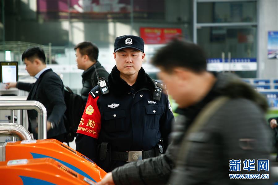 金寨火車(chē)站派出所民警呂錦鵬(前右)在檢票口執(zhí)勤(12月19日攝)。新華社記者鄧堅(jiān)攝