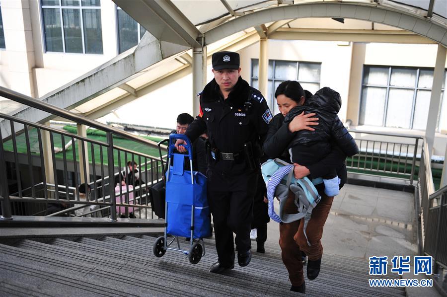 金寨火車(chē)站派出所民警何津超(前左)幫助旅客搬運(yùn)行李(12月19日攝)。新華社記者鄧堅(jiān)攝