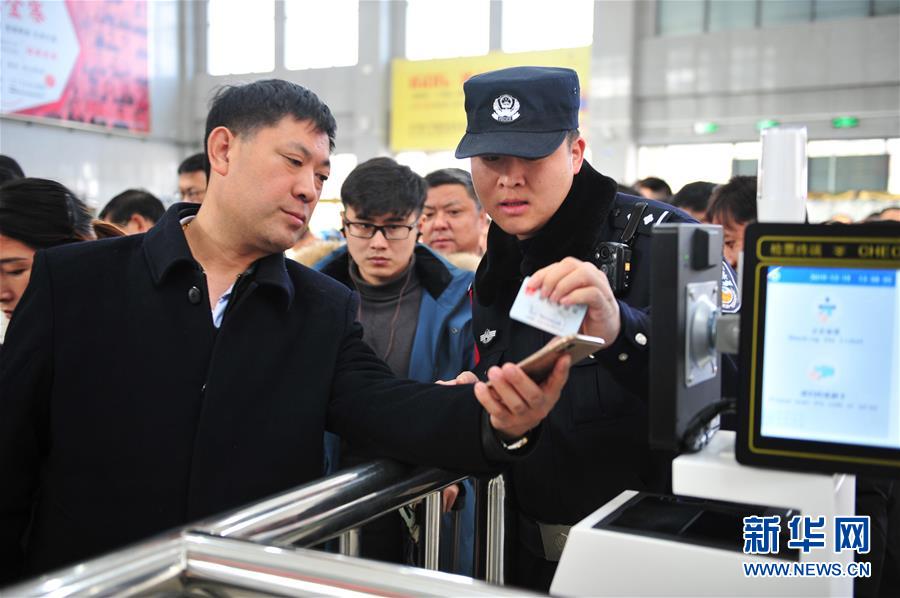金寨火車(chē)站派出所民警呂錦鵬(前右)在檢票口執(zhí)勤(12月19日攝)。新華社記者鄧堅(jiān)攝