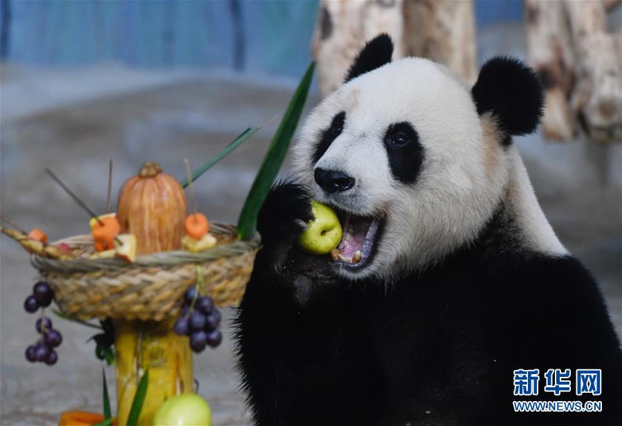 12月31日,大熊貓“貢貢”在吃梨。 新華社記者 楊冠宇 攝
