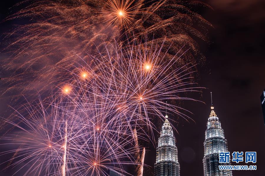 2020年1月1日,焰火在馬來西亞吉隆坡的馬來西亞國家石油公司雙塔旁綻放,迎接新年的到來。新華社記者朱煒攝