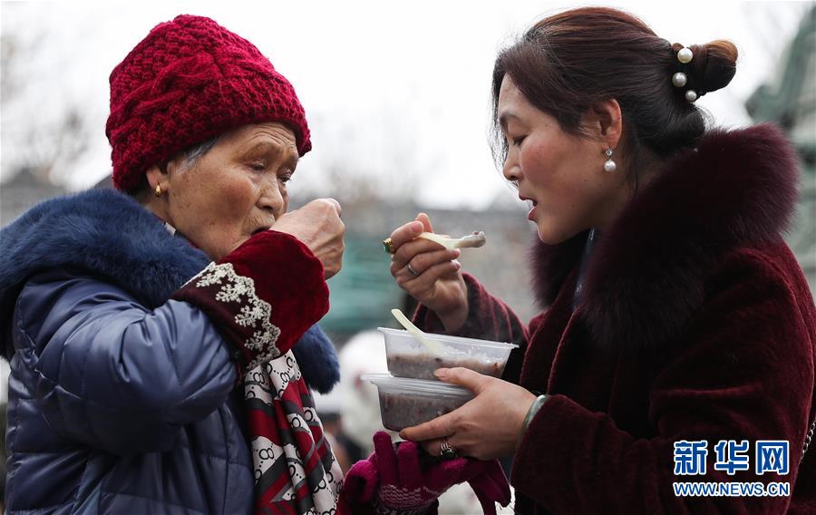 1月2日,兩位市民在閬中古城貢院廣場(chǎng)吃臘八粥。 當(dāng)日是農(nóng)歷臘月初八臘八節(jié),四川閬中古城舉行“萬人同品臘八粥”活動(dòng),當(dāng)?shù)鼐用窈捅姸嘤慰驮谪曉簭V場(chǎng)免費(fèi)享用臘八粥。 新華社記者 江宏景 攝