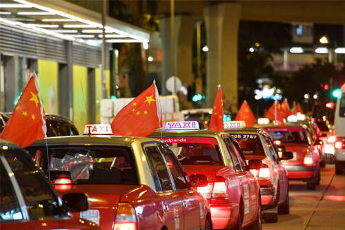 2019年8月23日,從香港港島筲箕灣出發(fā)的張掛中國(guó)國(guó)旗的出租車行駛在街道上。新華社記者劉大偉攝