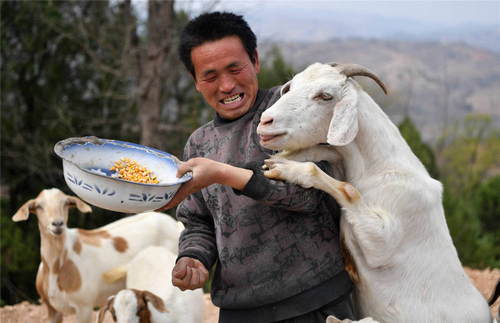2019年3月27日,在河南省盧氏縣沙河鄉(xiāng)果角村,村民任當(dāng)鋒在喂羊。41歲的任當(dāng)鋒曾多年在外打工,由于腰部有傷不能干重活。2018年,在知悉盧氏縣的金融扶貧政策后,任當(dāng)鋒返鄉(xiāng)創(chuàng)業(yè),用貸來(lái)的5萬(wàn)元無(wú)擔(dān)保無(wú)抵押小額貸款,購(gòu)買了38只羊,從打工仔變成了一個(gè)羊倌。 新華社記者李嘉南攝