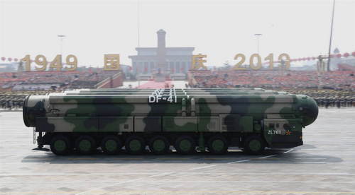 2019年10月1日,慶祝中華人民共和國(guó)成立70周年大會(huì)在北京天安門廣場(chǎng)隆重舉行。這是東風(fēng)-41核導(dǎo)彈方隊(duì)接受檢閱。新華社記者劉彬攝