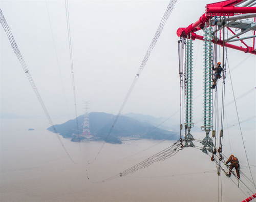 2019年1月3日,施工人員在浙江省舟山500千伏聯(lián)網(wǎng)輸變電工程380米跨海輸電鐵塔上進(jìn)行驗(yàn)收和消缺作業(yè)(無(wú)人機(jī)照片)。新華社記者徐昱攝