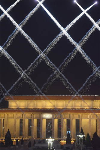 2019年10月1日,慶祝中華人民共和國(guó)成立70周年大會(huì)在北京天安門廣場(chǎng)隆重舉行。這是空中梯隊(duì)飛過天安門上空。新華社記者金良快攝