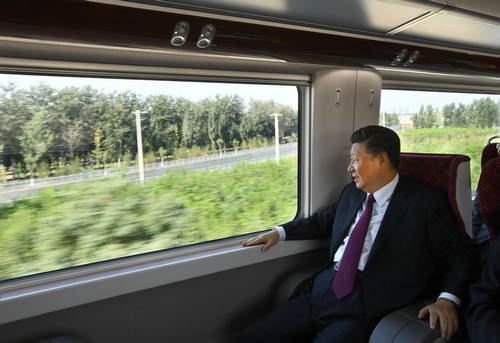 2019年9月25日上午,北京大興國(guó)際機(jī)場(chǎng)投運(yùn)儀式在北京舉行。中共中央總書記、國(guó)家主席、中央軍委主席習(xí)近平出席儀式,宣布機(jī)場(chǎng)正式投運(yùn)并巡覽航站樓。這是習(xí)近平乘坐軌道列車前往北京大興國(guó)際機(jī)場(chǎng)。新華社記者謝環(huán)馳攝