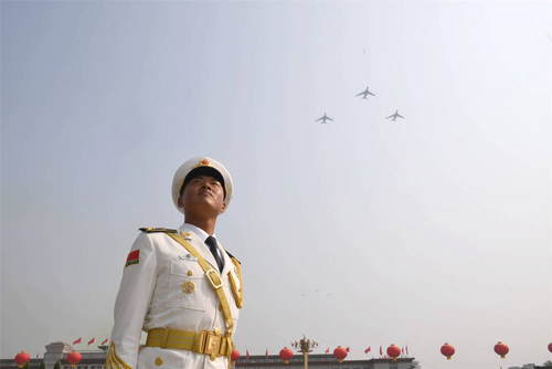 2019年10月1日,慶祝中華人民共和國(guó)成立70周年大會(huì)在北京天安門廣場(chǎng)隆重舉行。這是空軍方隊(duì)接受檢閱。新華社記者劉大偉攝