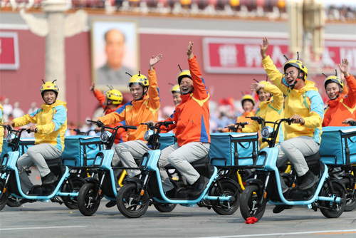 2019年10月1日,慶祝中華人民共和國(guó)成立70周年大會(huì)在北京天安門廣場(chǎng)隆重舉行。這是群眾游行中的美好生活方陣。新華社記者歐東衢攝