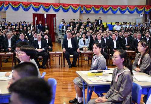 2019年12月19日,國(guó)家主席習(xí)近平在澳門特別行政區(qū)行政長(zhǎng)官崔世安陪同下,來(lái)到位于澳門黑沙環(huán)的政府綜合服務(wù)中心和濠江中學(xué)附屬英才學(xué)校,同澳門市民和師生親切交流。這是習(xí)近平在濠江中學(xué)附屬英才學(xué)校觀摩以“‘一國(guó)兩制’與澳門”為題的中國(guó)歷史公開課。新華社記者李濤攝