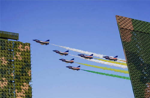 2019年10月21日,在吉林長(zhǎng)春舉行的慶祝人民空軍成立70周年航空開放活動(dòng)上,空軍八一飛行表演隊(duì)殲-10飛機(jī)編隊(duì)從靜態(tài)展示的新型雷達(dá)上空飛過。新華社發(fā)(萬(wàn)全攝)