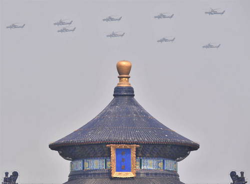 2019年10月1日,慶祝中華人民共和國(guó)成立70周年大會(huì)在北京天安門廣場(chǎng)隆重舉行。這是從天壇公園拍攝的陸航突擊梯隊(duì)。新華社記者賀長(zhǎng)山攝
