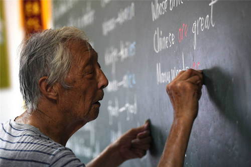 2019年7月30日,葉連平在“留守未成年人之家”教室里為第二天的英語(yǔ)課準(zhǔn)備板書。暑期伊始,在安徽省和縣烏江鎮(zhèn)卜陳村“留守未成年人之家”,92歲的退休教師葉連平又開始了暑假的忙碌。新華社發(fā)(黃博涵 攝)