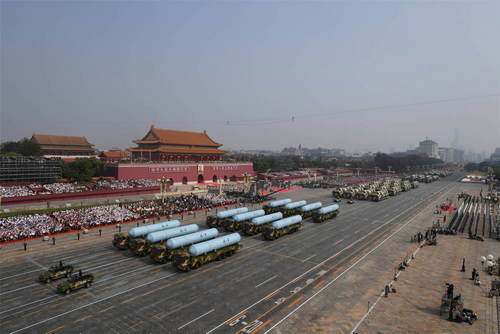 2019年10月1日,慶祝中華人民共和國(guó)成立70周年大會(huì)在北京天安門廣場(chǎng)隆重舉行。這是巨浪-2導(dǎo)彈方隊(duì)和東風(fēng)-31甲改核導(dǎo)彈方隊(duì)接受檢閱。新華社記者翟健嵐攝