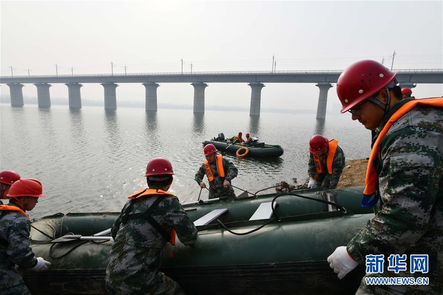 1月3日,中國(guó)鐵路濟(jì)南局鐵道戰(zhàn)備舟橋處工程人員準(zhǔn)備船只前往預(yù)定地點(diǎn)檢查橋墩。