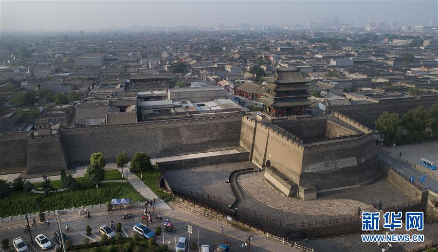 這是7月20日無人機從南門拍攝的平遙古城全景。鳥瞰平遙古城,形同一只欲行未動的烏龜,“龜”頭南尾北,上下東西四門比擬為龜之四足,故有“龜城”之說。